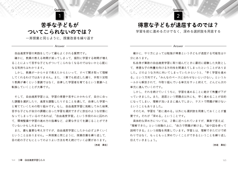 本書は多くの先生方が「深い学び」を実現するための手段の一つとして、自由進度学習という選択肢を持てるよう、「作り方」に焦点を当て、複数の実践者の視点から、可能な限り具体的に記載しました。