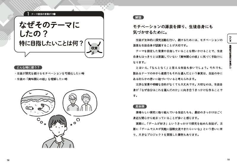 本書は、主に中学校・高校における探究の進め方と、それぞれの場面に応じた「言葉がけ」の例を紹介する本です。