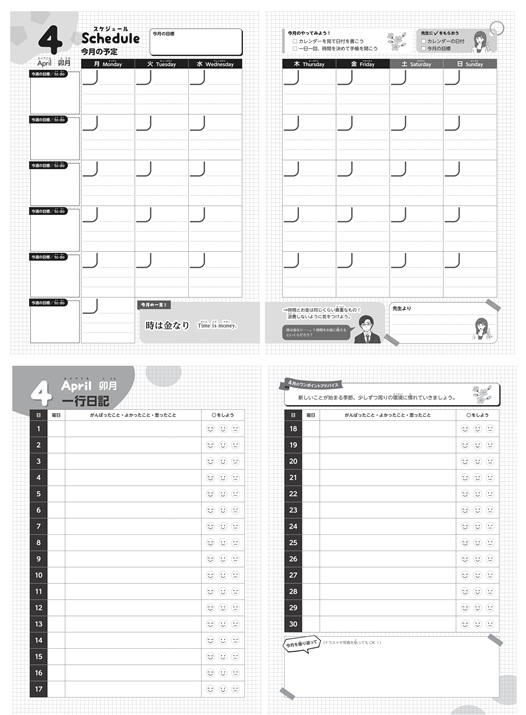 予定が「見える化」できるフリースタイル(学校生活にあわせて4月からデザインの日付記入式)の「スケジュールページ」、自分の毎日の気持ちが記録できる「一行日記」、また、「テスト勉強計画表」「モチベーションアップページ」など、学校生活に役立つページが、それぞれイラスト付きで満載。