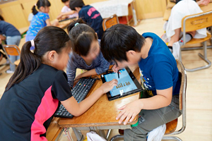 とは言え、「スクラッチ」でプログラムを組んだことがない筆者にとっては、ついていくのが精一杯。しかし児童達はわずか5分程度の説明を受けただけですんなり理解したようだ。2~3人ずつのグループに分かれ、各々タブレットPCとUSB接続キーボードを机に持ってくると、待ちかねたとばかりに勢いよくプログラム作りに取りかかった。