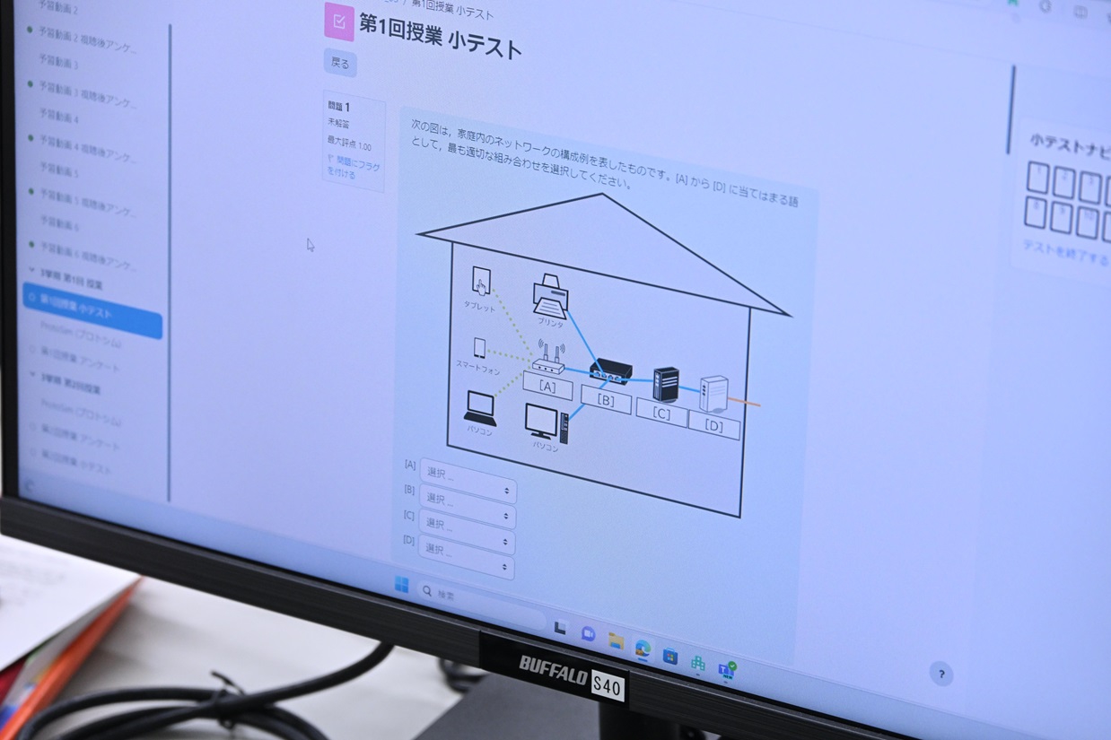 はじめに、冬休み中に動画教材で学習した内容の確認テストをMoodle(オープンソース学習管理システム)上で実施した。生徒たちは真剣な表情でモニターに向き合い、学習の内容を思い出しながら問題を解いていた。