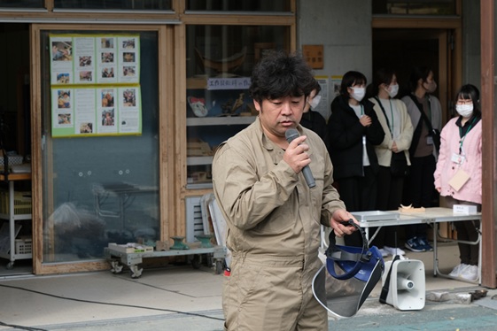 火を扱う活動であるため、冒頭では、鉄釘を触るときは革製軍手を、火花を覗くときはフェイスガードを着用することについて、植林教諭からていねいな説明があり、安全管理が欠かせないことが強調された。