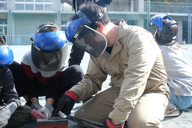 授業では、児童たちが火と鉄という危険をともなう素材に向き合いながら、互いに声をかけ合い、工夫してナイフづくりに取り組む姿が印象的だった。慎重に熱したくぎを打ち、くぎが曲がっても調整しながら、楽しそうに作業を続ける姿からは、ものづくりへの興味と集中力が自然に引き出されていることが伝わってきた。このような学びは、安全や手順を配慮した授業の積み重ねと、児童一人ひとりの理解に応じた指導があって初めて可能になると感じた。