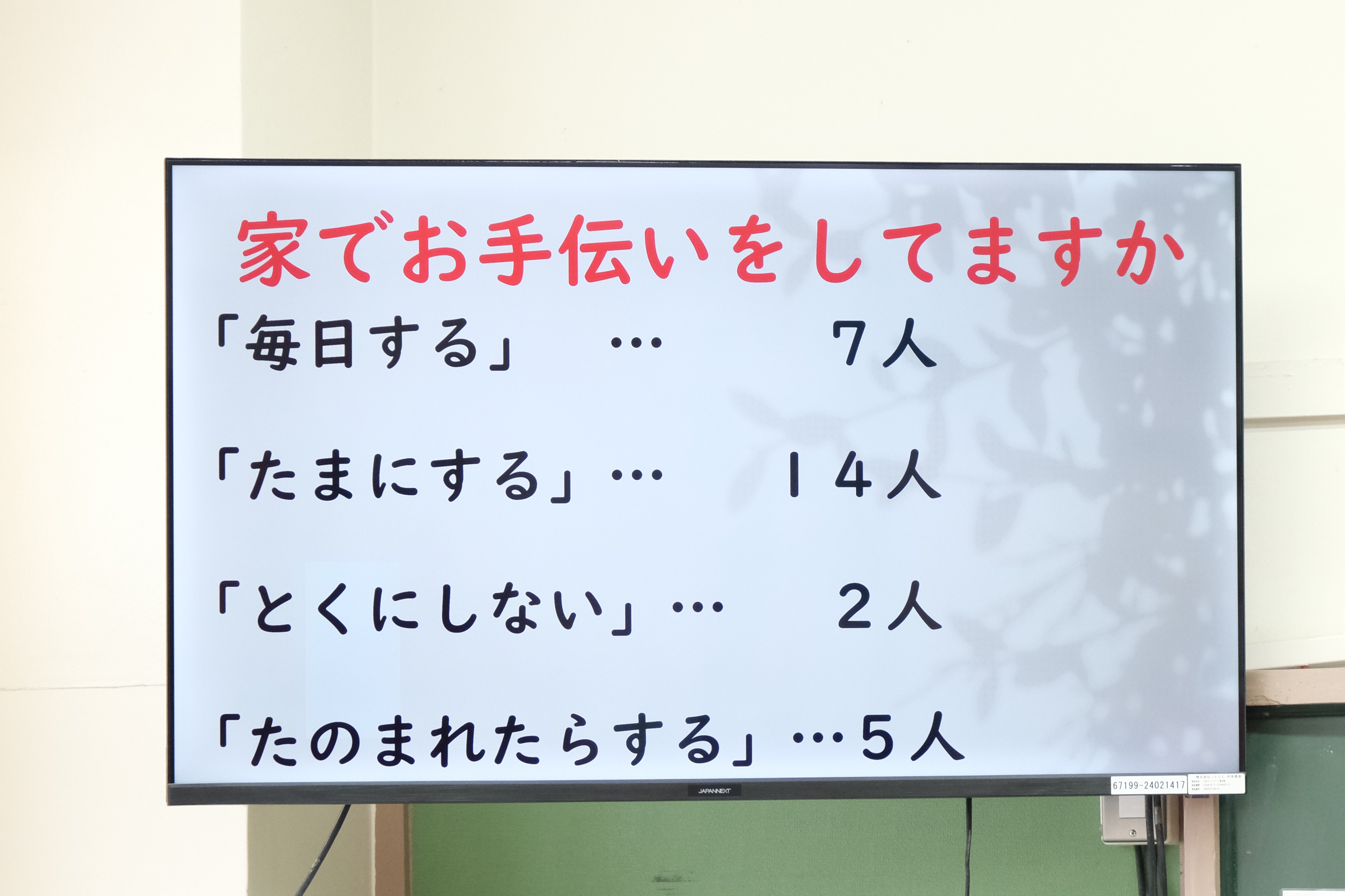授業は、児童たちに事前に行ったアンケート結果の紹介から始まった。アンケートは1月中に実施したもので、質問は「家でお手伝いをしていますか」というもの。28人の児童の回答は、「毎日する」が7人、「たまにする」が14人、「たのまれたらする」が5人、「とくにしない」が2人だった。