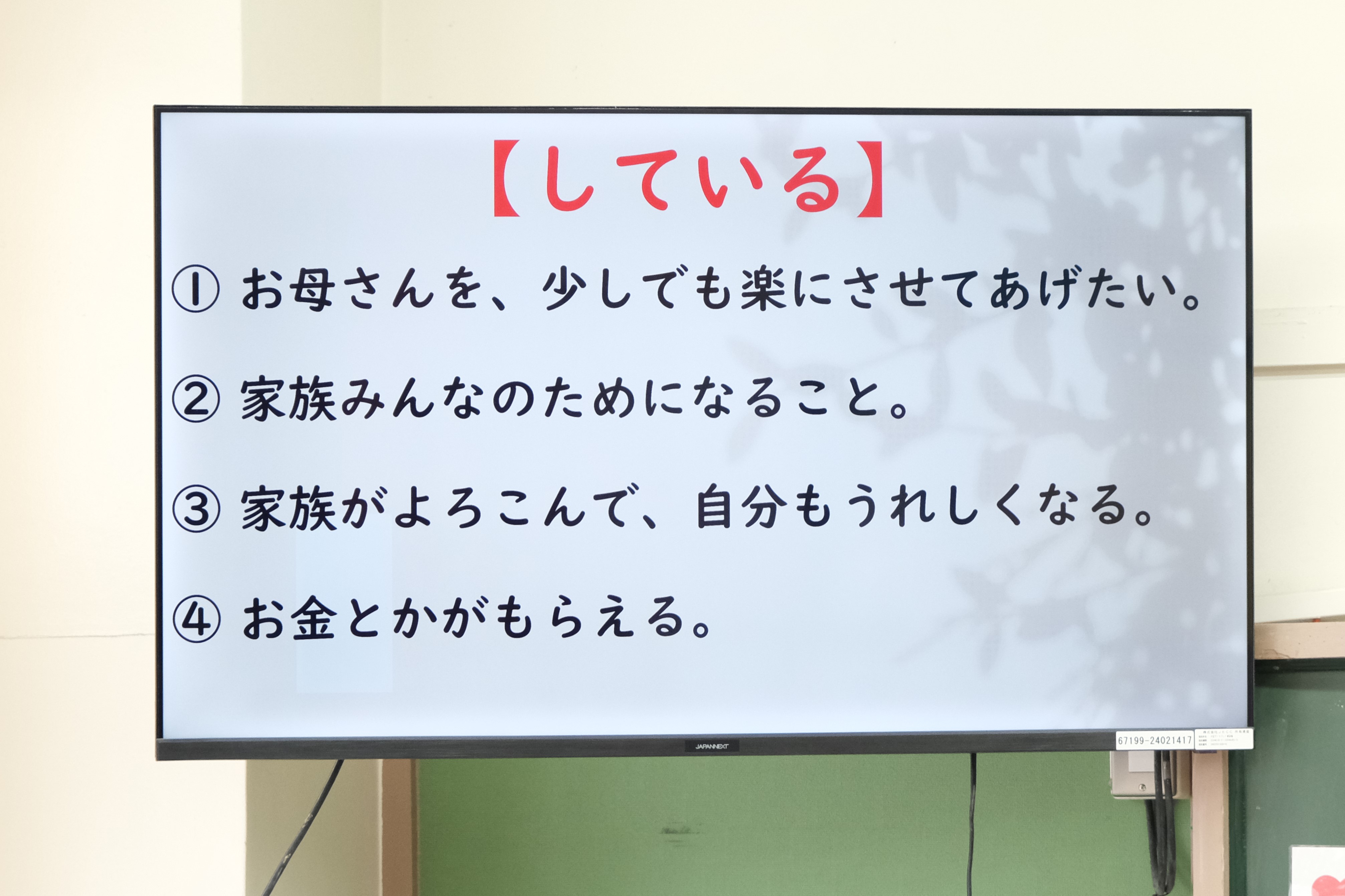 ここで授業は、最初に掲げたテーマ「家族にとってのよろこび」に立ち返る。これまでの児童の発言を振り返る中で、「お金のためではない」という考えが教室の中で共有されていった。