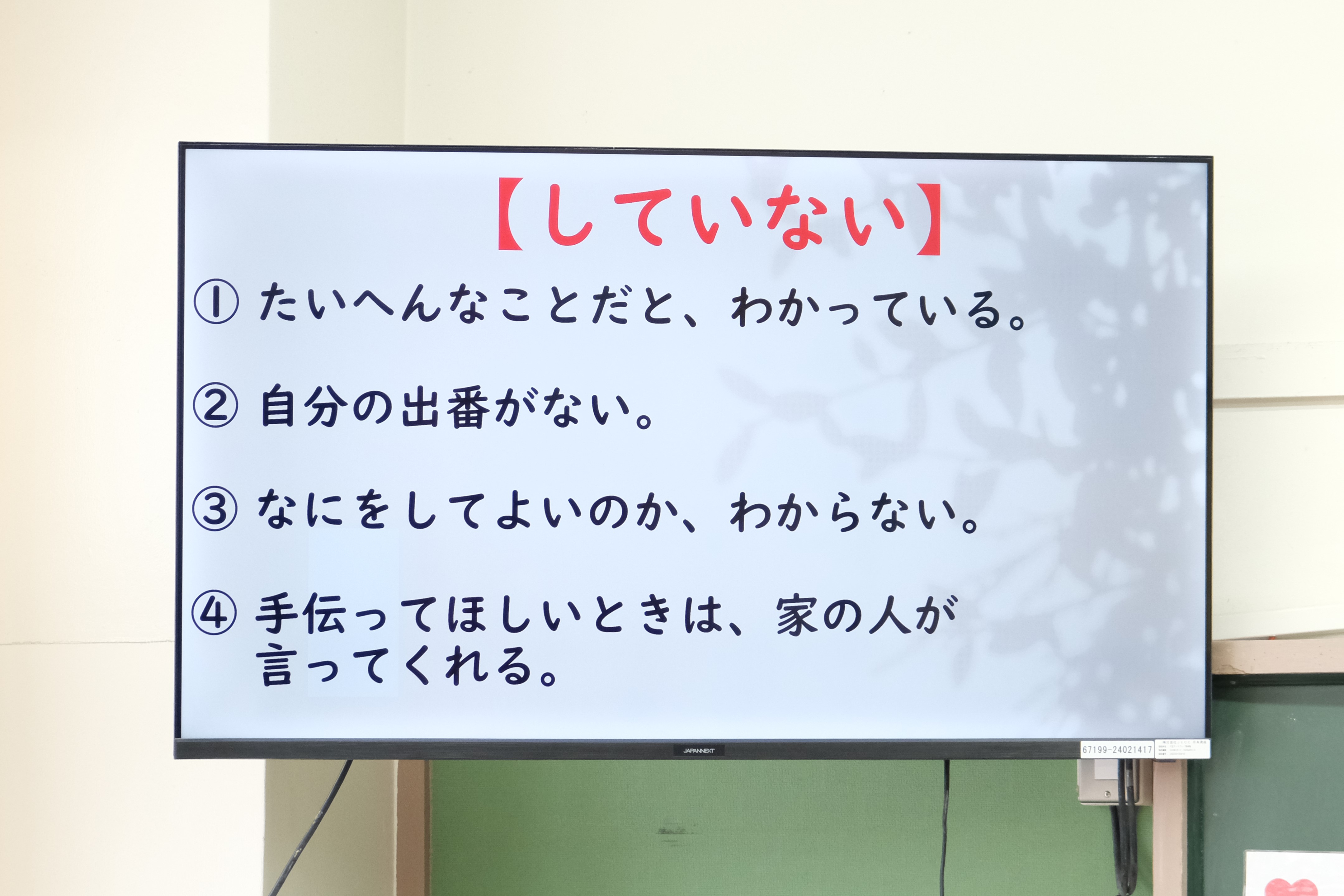 「家族のために自分から行動なんて、どうしてもできなそう」と行動に移す自信はないという正直な意見もあったが、多くの児童が、家族への感謝の気持ちを発表していた。