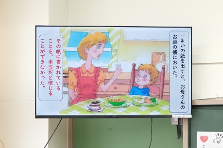 「ブラッドレーのせいきゅう書」の読み聞かせでは、大型モニターに挿絵と本文のポイントを表示しながら、柿原主任教諭が物語を読み進めた。読み聞かせの後、柿原主任教諭が「物語を聞いて、どんなことを感じましたか」と問いかけると、児童たちは次々と手を挙げて意見を発表した。