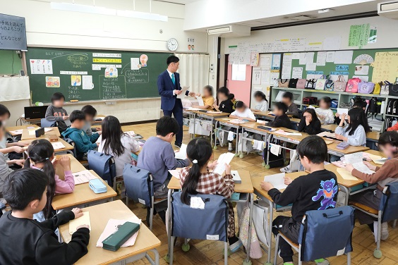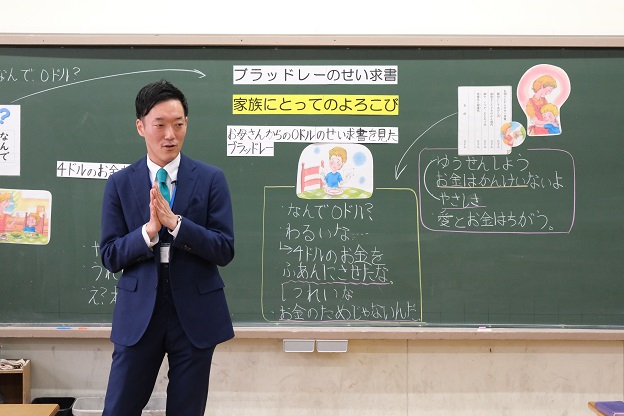児童の一人が「せいきゅう書ってお金のこと?」と質問すると、柿原主任教諭は請求書の意味や、物語に登場する通貨単位「ドル」について説明し、本時の授業のテーマとして「家族にとってのよろこび」を提示した。