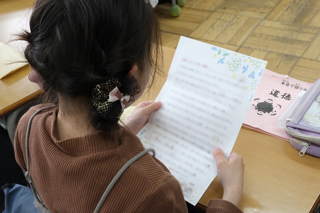 家族のよろこびが何なのかを少しずつ言葉にしていった児童たちに、授業の終盤であらかじめ保護者にお願いしていた、「子どもたちへの手紙」が配られた。封筒に入った手紙を取り出し、児童たちは静かに手紙を読み始める。