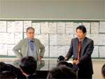 ずらりと並んだ生徒たちの俳句 ゲストの青柳先生(左)と 国語科の加藤先生(右) ![]() みんなで推敲してみよう