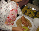 4年生のRちゃんとお母さんが参加の牧野チームの作品は「なんちゃってチーズアップルパイ」。餃子の皮をめん棒で薄く伸ばして、甘く煮たリンゴと溶けるチーズをはさんで揚げます。「りんごだけでは栄養素的に物足りないのでチーズを加えた」というおかあさんは栄養士さんだとか。納得です。餃子の皮をわざわざ伸ばすのは、パリパリ感が出ることと、薄くすることで、油で揚げてもあっさり仕上がるためだそうです。