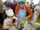 1年生のHくんと4年生のAちゃん、それにお母さんの3人で参加の秋山チームは、「ミルクくずもち餅」作りで参加。くず粉の代わりに、手に入りやすい片栗粉やコーンスターチで作るのがミソ。また牛乳を入れることで栄養価もアップ。お母さんは、パン教室の先生をしているとかで、さすがの手際のよさ。子どもたちもとても作りなれているようすでした。