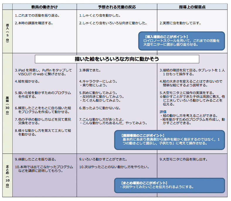 また、小学校低学年の例と中学校の例では、「絵を動かす活動」である点で共通していましたが、前者は「絵を指定の場所に配置する」という単純で感覚的な内容だったのに対し、後者は「順次処理・反復処理・並列処理」といった複雑な概念を交えており、発達の段階に即して発展的になっていました。