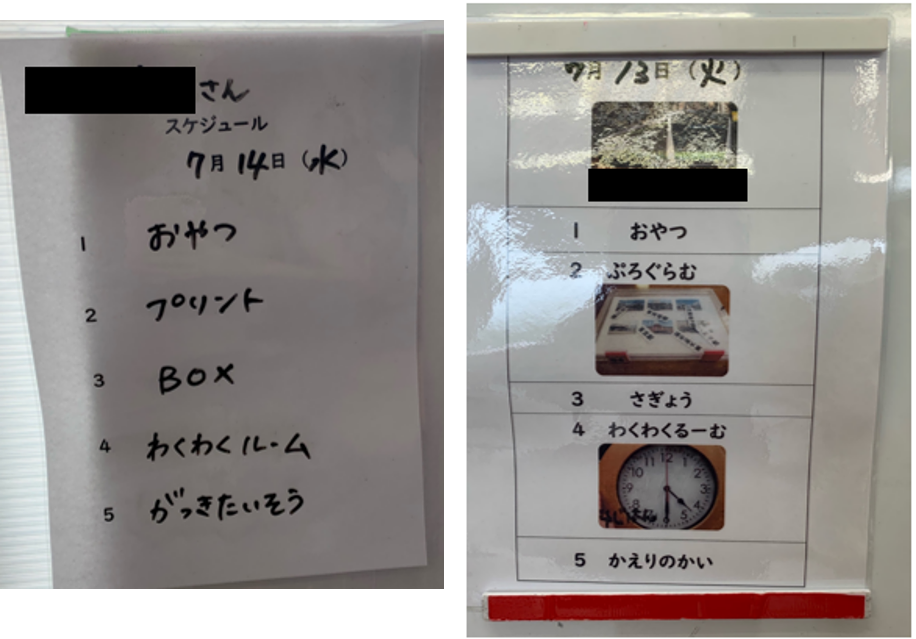 今回著者が訪問させていただいた「放課後等デイサービス子笑(こえみ)」では、アセスメントを非常に重視しており、学校・保護者と連携しながら一人ひとりに適した環境づくりを行っています。例えば、一日の流れをわかりやすく示すとしても、写真の例のように一人ひとりに合わせたやり方で示すように工夫されています。文字で示すのが良いのか、写真があった方がよいのか、写真ではなくイラストの方が良いのか、などを職員の方々で検討することで、個人に適した支援を行っています。