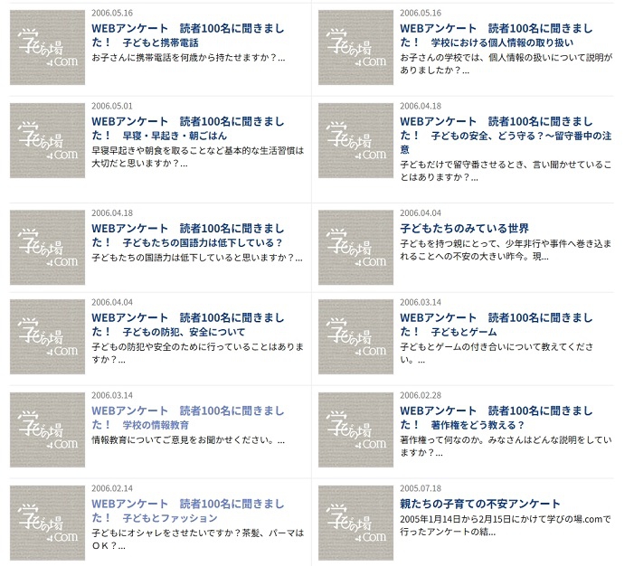 保護者会員を対象に様々なWEBアンケートを行いました。当時の子育ての悩みや工夫について、統計情報ではなく、テキストの自由記入よる100人の生の声がPDFで閲覧できます。質問項目は多岐に及びます。こどもが携帯電話を持ち始めた時代ですが、まだSNSはありません。当時の保護者の皆さんが、子育てや学校教育にどんな思いを寄せておられたのか?とても興味深い資料です。