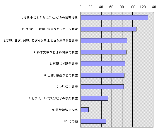 こちらのグラフは、主に”教育内容で力を入れてほしいこと”をお聞きした結果です。少子化と習い事全盛の現在では、ほとんどが学校外のサービスとして提供されていることが分かります。また、当記事内では選択式質問だけでなく、回答者のフリーコメントも紹介しています。こちらも先生方にとっては興味深い資料となっています。お時間のあるときに覗いてみてください。