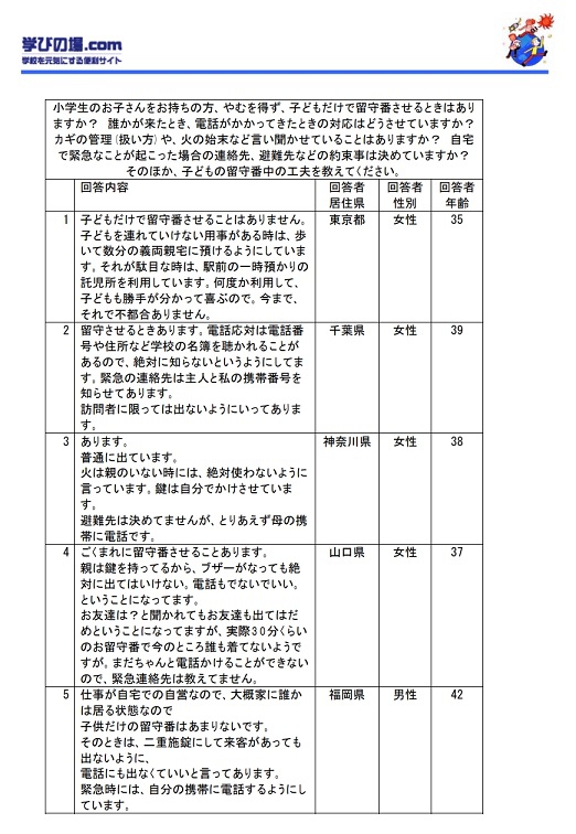 【質問項目】小学生のお子さんをお持ちの方、やむを得ず、子どもだけで留守番させるときはありますか? 誰かが来たとき、電話がかかってきたときの対応はどうさせていますか? カギの管理(扱い方)や、火の始末など言い聞かせていることはありますか? 自宅で緊急なことが起こった場合の連絡先、避難先などの約束事は決めていますか? そのほか、子どもの留守番中の工夫を教えてください。