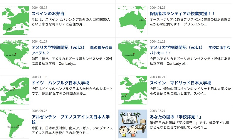 海外日本人学校の先生をはじめ、海外在住のみなさんが、各国の教育事情や、生活、文化、歴史などを紹介します。国際理解の教材としてもどうぞ。