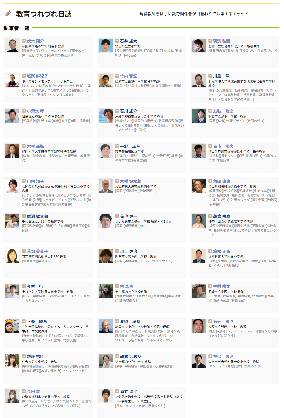なかでも、2007年に始まった「教育つれづれ日誌」は、学びの場.comの「顔」として現在も読者の皆様に広く愛され続けているコンテンツです。半年ごとに公募を行い、教育現場で奮闘されている先生方から寄せられる「生の声」を現在も日替わりでお届けしています。これまでに130名以上の方々が執筆されていらっしゃいます。こうした先生方のご協力に支えられながら学びの場.comは続いてきました。