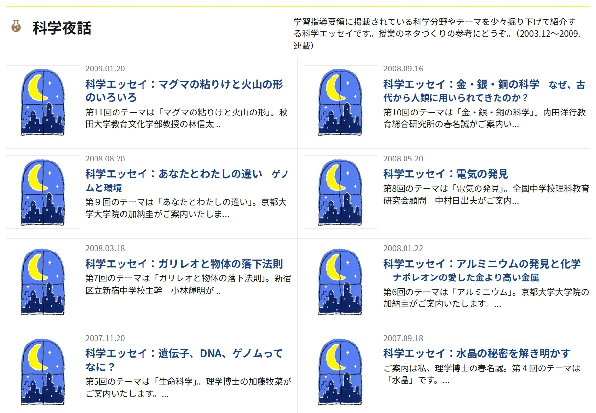 「科学夜話」は、理科や科学に関するちょっとした豆知識のシリーズです。授業で使えそうな小ネタがいっぱいです。