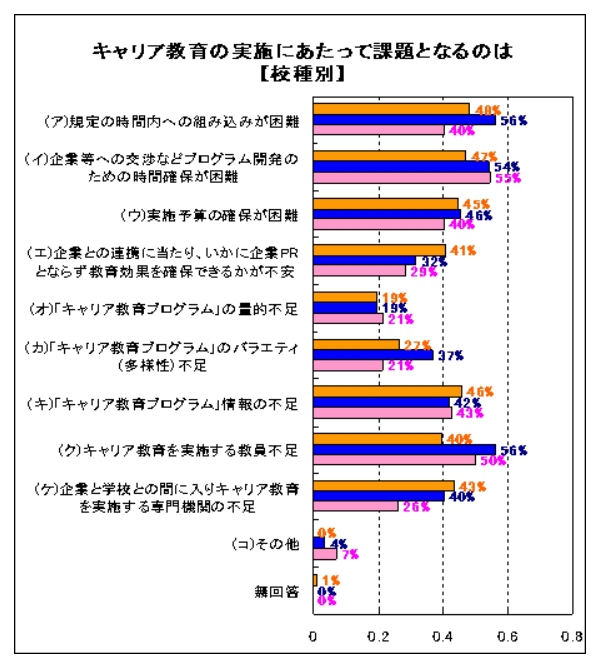 2004年に、小・中・高校の先生方を対象に、当時のキャリア教育の実態をお聞きしたアンケートです。当時は実施に当たっての明確なガイドラインの不足や企業との連携に戸惑う先生方が多くいらっしゃいました。