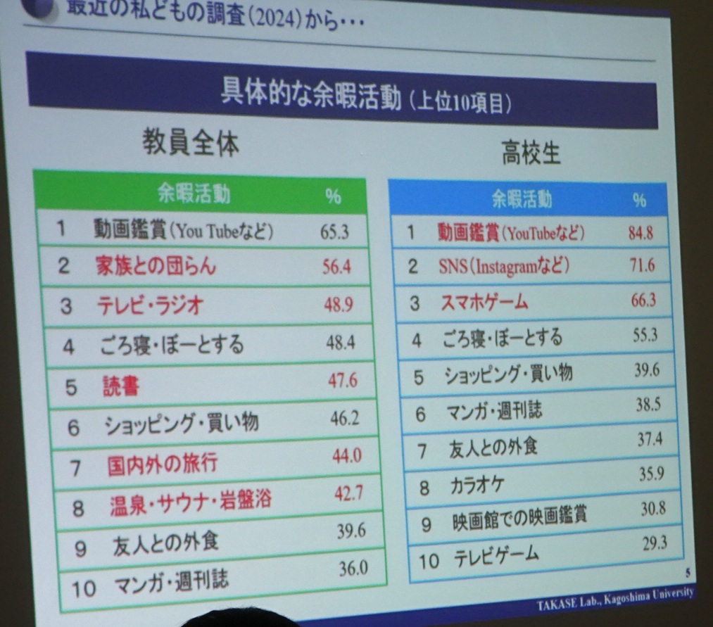 その後、髙瀬先生が高校生の余暇の過ごし方ランキングを紹介、さらに教員の余暇ランキングを予想させた。結果は1位が動画鑑賞でこれは高校生と同じだった。髙瀬先生が余暇について注目した訳は、ドナルド・E・スーパー提唱の「ライフキャリア・レインボー」という理論において、人間がさまざまな役割を演じながら生きていく中で「余暇を楽しむ人」も一つの役割として位置づけられており、余暇の充実がリスクに対する新しいアプローチになると考えたためだという。