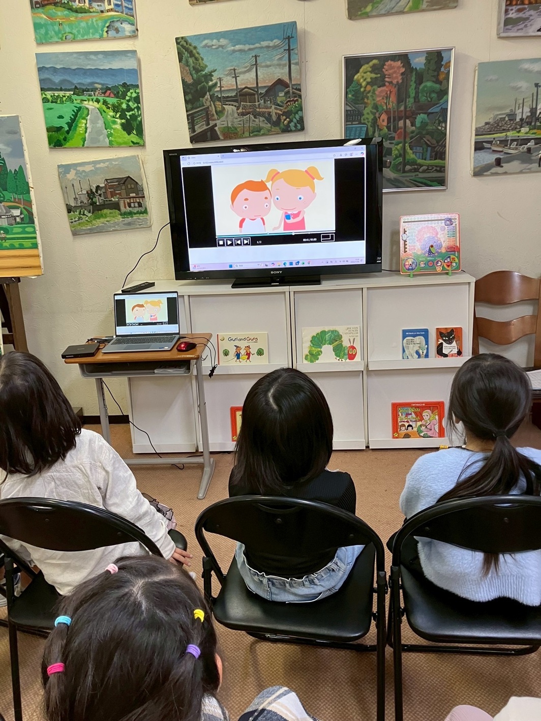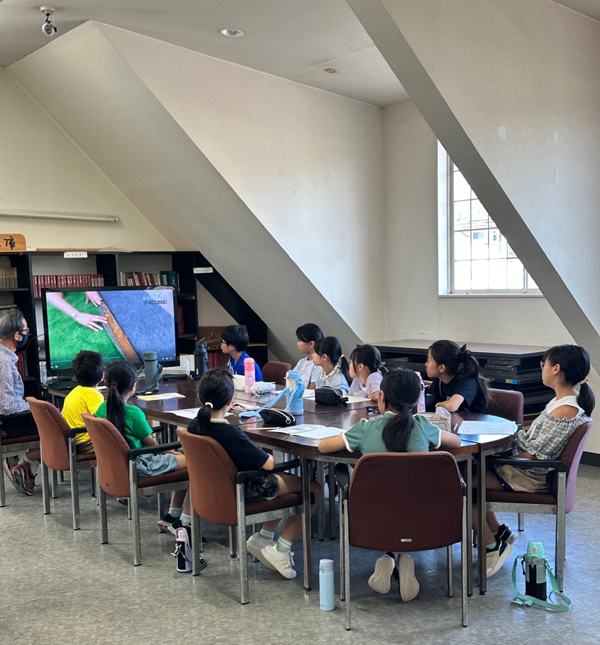 アトリエハウス児童クラブ側では、制作したインタビュー動画を見せながら、英語で解説した。