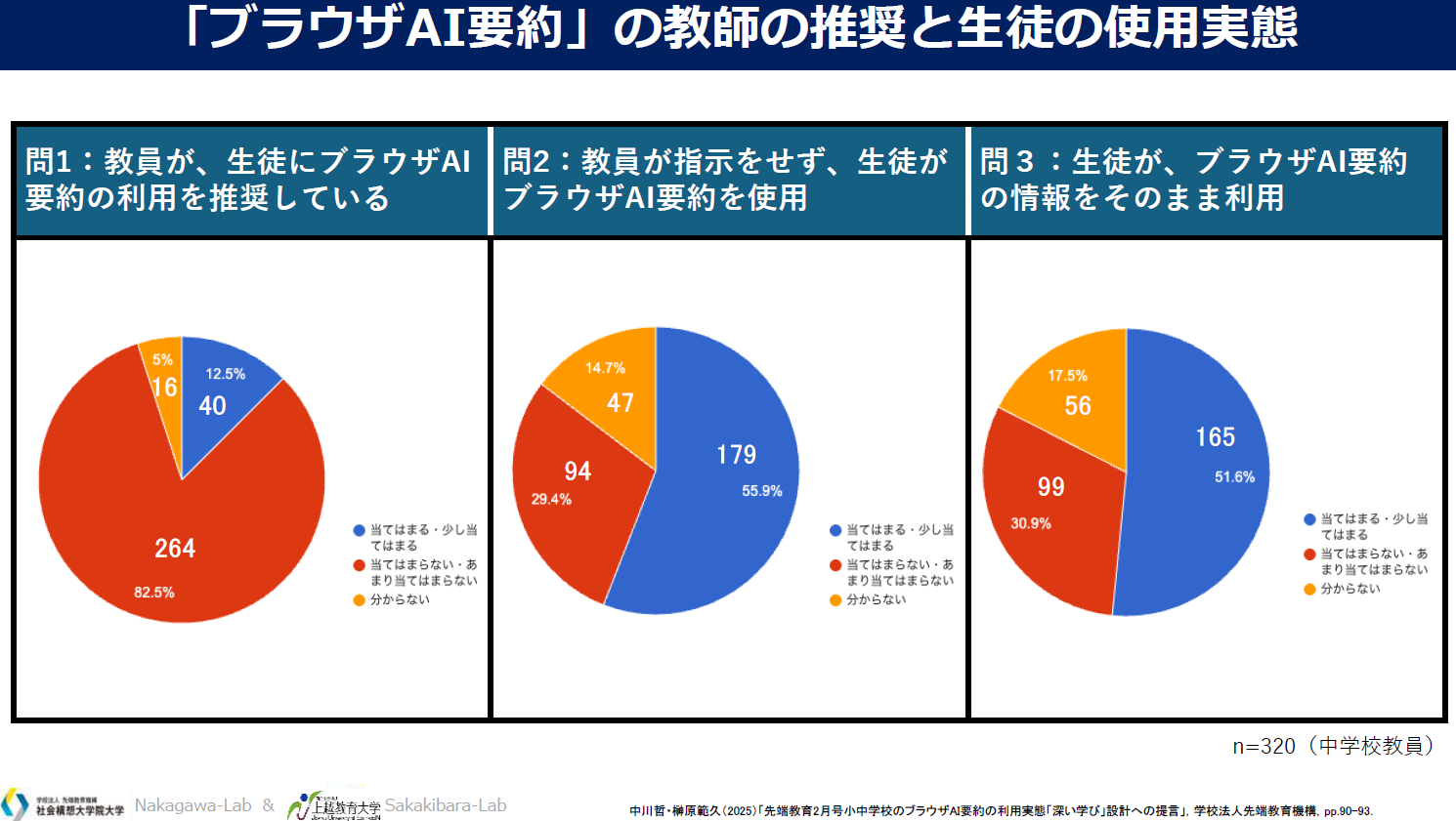 学校現場で利用されうる生成AIにはブラウザAI要約のほか、ChatGPTやGeminiに代表される対話型生成AI、教育用に用途を限定した学校向け生成AIの3種類がある。中川氏が2025年に行った調査によると、教員の指示なく生成AIを利用している小中学生の割合は、対話型生成AIで18.2%、ブラウザAI要約で38.5%。いずれも「指示なく利用している」割合と「情報をそのまま用いる」割合がほぼ一致しており、中学校では5割を超えるのが現状だ。