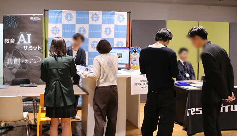 展示ブースはEdLogが展開する「クリップ採点支援システム」をはじめ、コニカミノルタジャパンが手がける対話型生成AI機能を搭載した学習支援サービス「tomoLinks」、NPO法人みんなのコードが提供する授業用教材「みんなで生成AIコース」など、最新のAIツールやDXツールが体験できる場となっていた。また、NPO法人CORE EDUCATIONがAI時代に求められる人間力を育む学習支援サービスを紹介。佐藤氏が代表理事を務める教育 AI 活用協会のブースでは、同協会が認定するAI先端モデル校である青楓館高等学院のAI部による生成AIを活用したプロジェクト型学習の成果報告が行われていた。