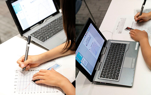 しかし、紙のワークシートにただ書かせるだけではなかった。ここで活躍したのが、デジタルペン(Neo smartpen N2)だ。これは、普通のペンのようにインクで書けるだけでなく、ペンの軌跡をそのまま記録、デジタル化し、リアルタイムにタブレット端末等のモニタに表示するという優れ物だ。つまり、子どもが紙のワークシートにデジタルペンで折れ線グラフを書いていくと、同時に自分のタブレット型PCで開いたデジタルワークシートにも、折れ線グラフが書かれていくのである。まるで透明人間がPCを操作してグラフを書いているような、不思議な光景だ。
