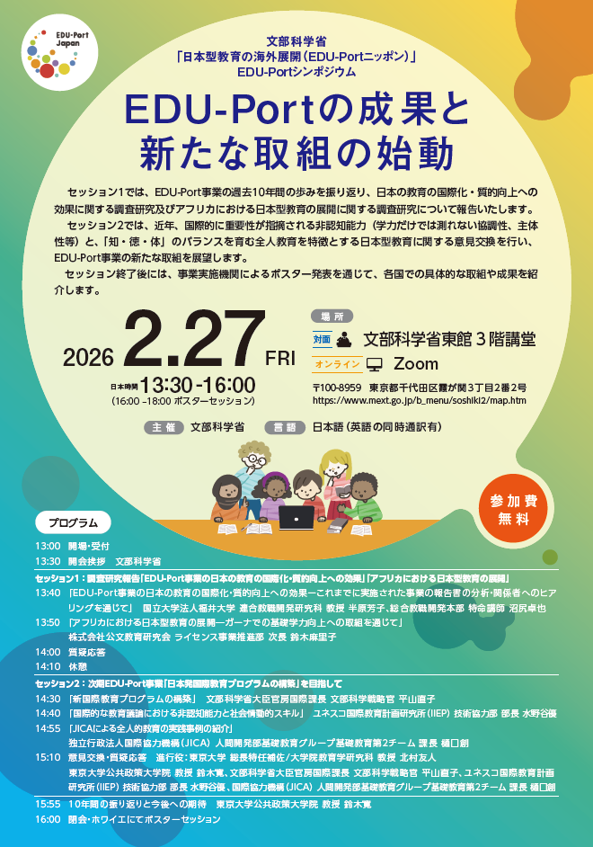 平成28年4月に開始した文部科学省「日本型教育の海外展開(EDU-Portニッポン)」は令和8年3月で丸10年を迎えます。この度EDU-Portは、「EDU-Portの成果と新たな取組の始動」と題し、令和7年度シンポジウムを開催いたします。