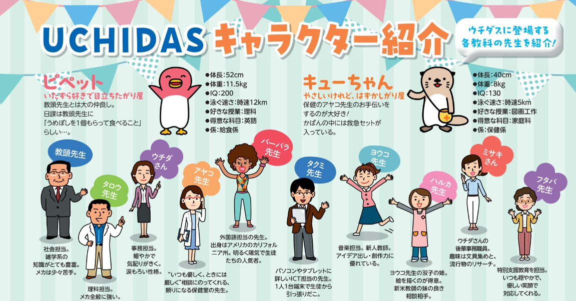 なお、シールにはなっていませんが、ウチダスのカタログには、ピペット、キューちゃんの他に、各教科の先生のキャラクターもいます。