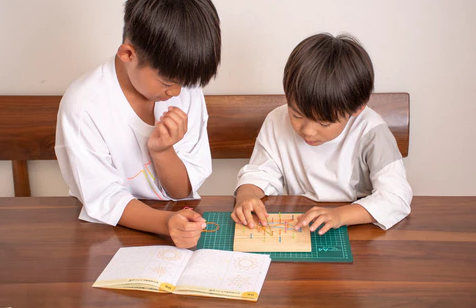 板に釘を打ち、打った釘に輪ゴムをかけてさまざまな図形を作る遊びです。