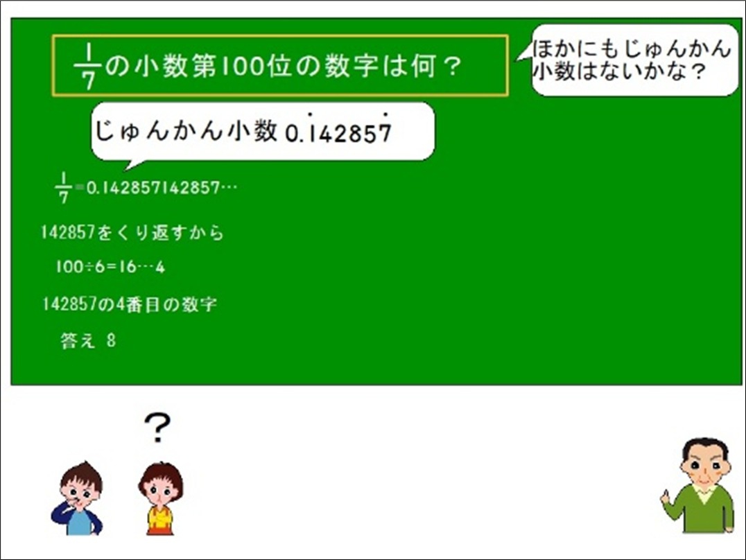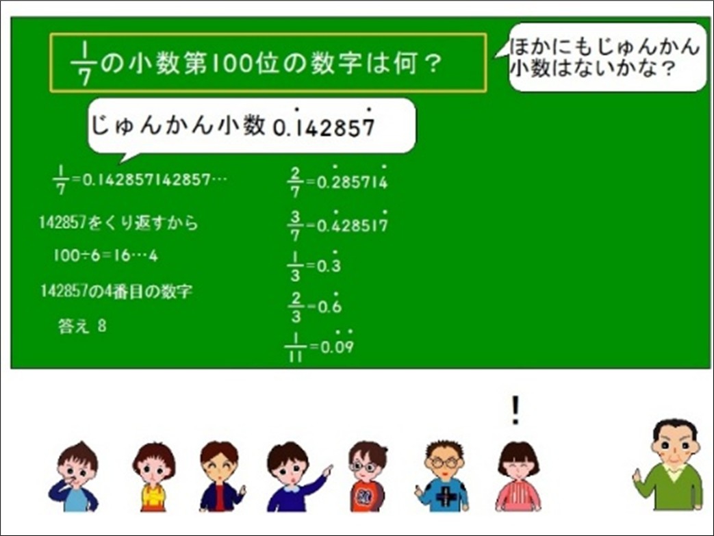 また、計算技能面だけで考えると、小学校4年で習う「わり進むわり算」ができれば求められます。また、小学校5年の「分数と小数」で子供の考えを生かして授業していると、13や111などの循環小数になる分数が自然に出でくるので、5年の「分数と小数」の発展として扱うこともできます。