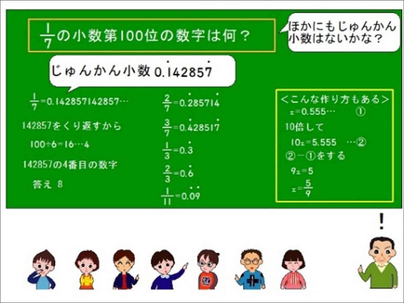 「実は、自分で適当に作った循環小数を分数にする方法があります。少し難しいけど知りたいかな?」と投げかけてみると、