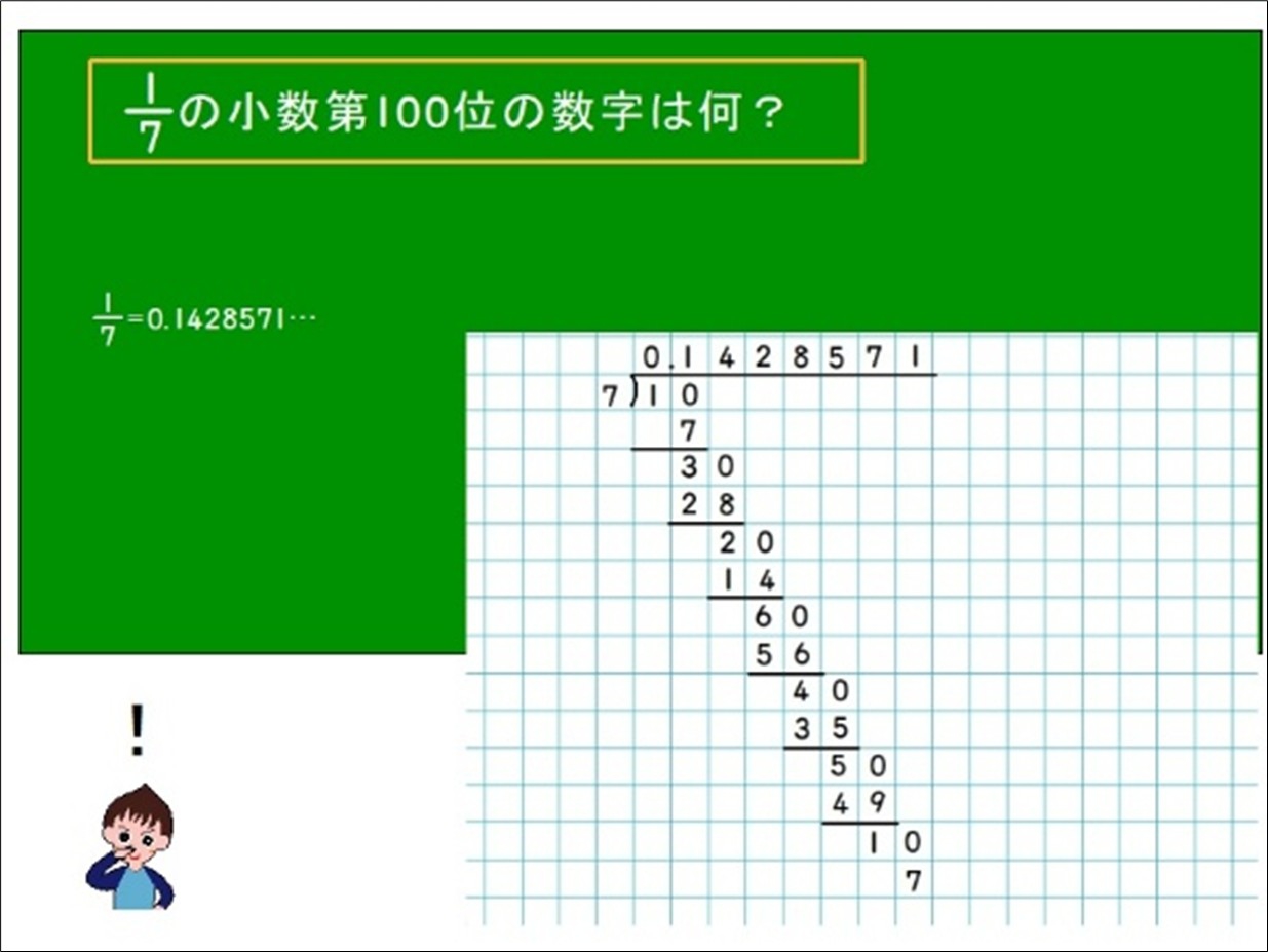 それを「1÷7」の筆算で確かめながら、割り進めていきます。「0.1428571」まで割り進めた時点で、隠していた□を外し、100を提示します。