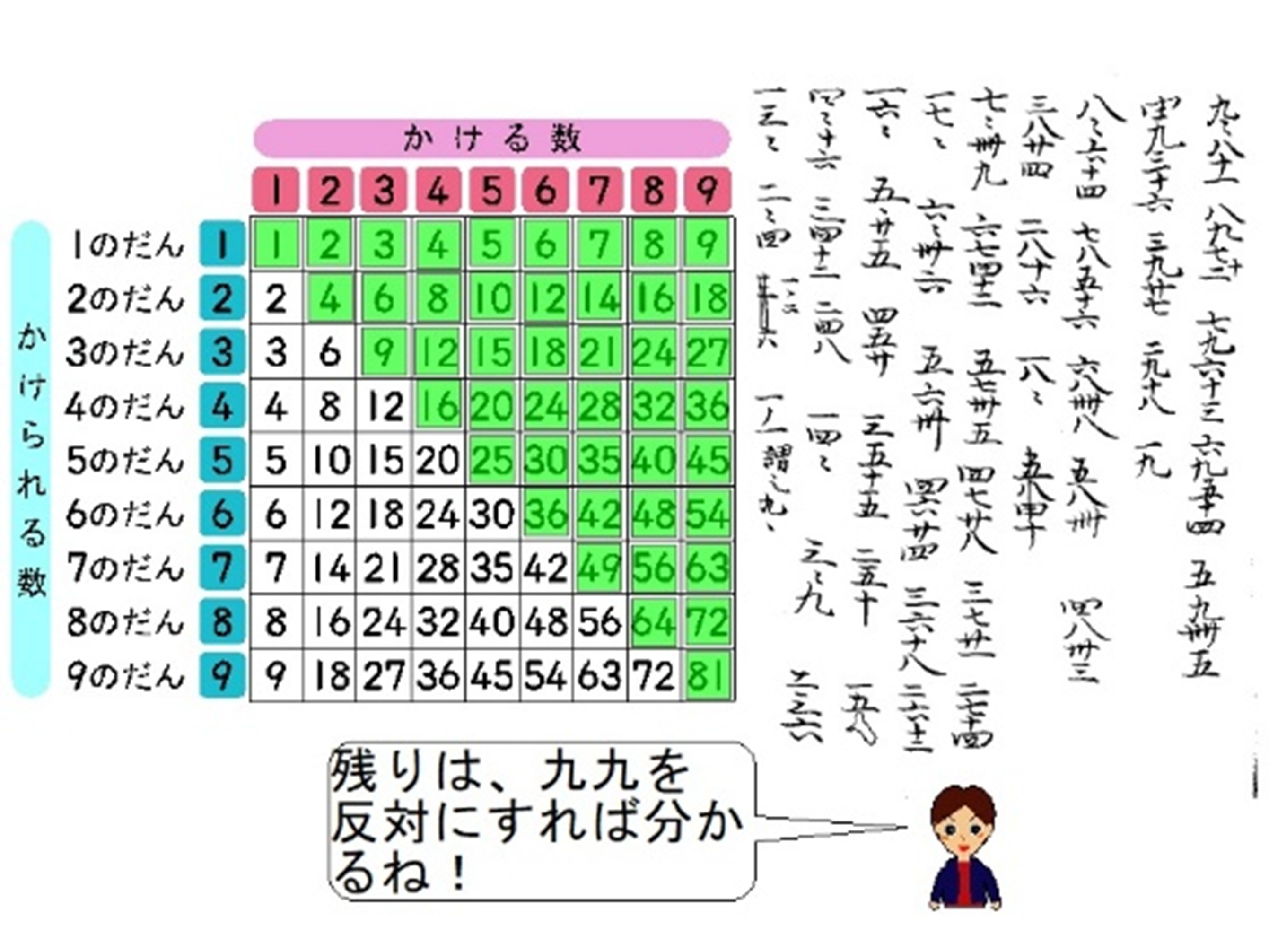 - 現在使われている総九九(81通り)ではなく、半九九(交換法則を適用した45通りの九九)であること。
