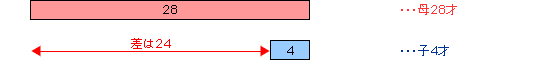 次のように現在の年令を線(ここでは棒)で表します。母と子の年令の差は24才です。