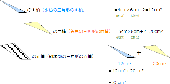 この斜線部の面積を求めるときには,次のように2つの三角形(水色と黄色)に分けて面積を計算して,2つの面積を合計することにより,斜線部の面積を求めます