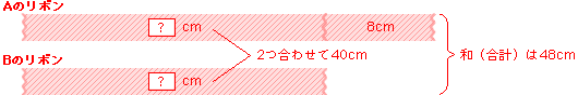 和(合計)は48cmですから、仮にAのリボンの8cm分をのぞいた場合、残りは
