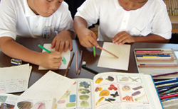 次に、図書室に行き、図鑑や百科事典、科学読み物などを調べて野菜の絵を描いていきます。先ほどまでいやだと言っていた子も喜んで描いています。1 枚のトウモロコシの絵をていねいに仕上げる子、ダイコン、ナス、カリフラワー、トマトと友だちの分まで絵を描くのに熱中する子とさまざま。6年生でも本当 に楽しそうに描いています。
