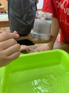この実験の材料は、茶こし、洗剤、水を貯めておくボウル、プラコップ等。基本的に百円均一ですべてそろえることができます。私もこの実験の時には生徒一人ひとり分の実験道具を用意しました。