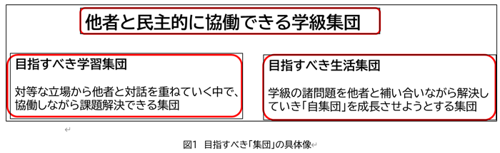 今回は、図1の「目指すべき生活集団」を実現するための手立てについて紹介しようと思います。まず確認すべきポイントは、最上位目標である「他者と民主的に協働できる学級集団」をさらに分解したところに「目指すべき生活集団」があるという点です。そして、この「目指すべき生活集団」を「学級の諸問題を他者と補い合いながら解決していき『自集団』を成長させようとする集団」と置いていることです。