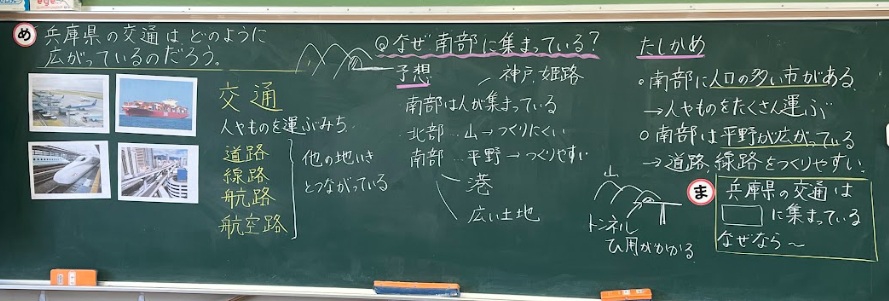 このような過程を通して本時の問い「兵庫県の交通はどのように広がっているだろう」が成立します。さらに、県内の交通分布を示す資料を提示し、兵庫県の交通にどのような特徴があるかを話し合います。その後、交通が南部に集中していることを確認し、「なぜ、兵庫県の交通は南部に集まっているのだろう」という、新たな問いを設定します。