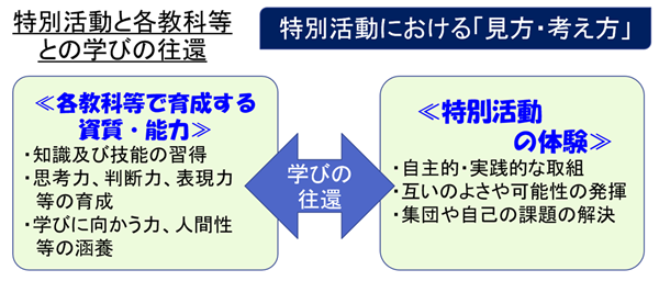 特別活動は,実践的な活動として,様々な集団活動において,自己や集団の生活上の課題の解決に取り組むものである。このため,各教科等の学習で獲得した資質・能力などが,集団活動の場で総合的に生かされ,発揮されなければならない。逆に,各教科等で育成された資質・能力は,特別活動において,実生活上の課題解決に活用されることによって,思考力,判断力,表現力等は鍛えられ,知識や技能は実感を伴って体得したり,各教科等を学ぶ意義の理解が深まったりするなど,より確かなものとなっていく。