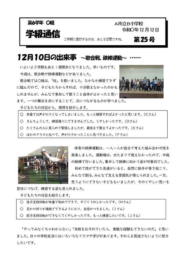 この学級通信では、学期末を迎えた12月10日の出来事、委員会主催で行われた「歌合戦」と体育の鉄棒の授業をテーマとして、子どもの声(その日の日記)を紹介しながら、担任としての思いや願いを伝えたものです。