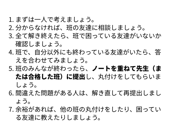 この活動を円滑に進めるため、授業のはじめに図のような指示を出します。
