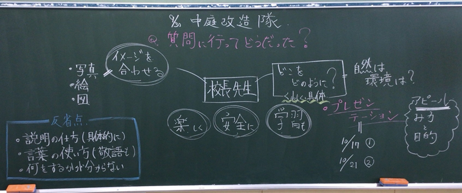 しかし、ある子から「でも、中庭って誰かがきれいにしてくれているわけやん。今の現状とか、どこまで可能なのかをしっかり聞くべきじゃない…?」と、実際に動いてくためには、現状を知らないといけないという考えが発言されました。
