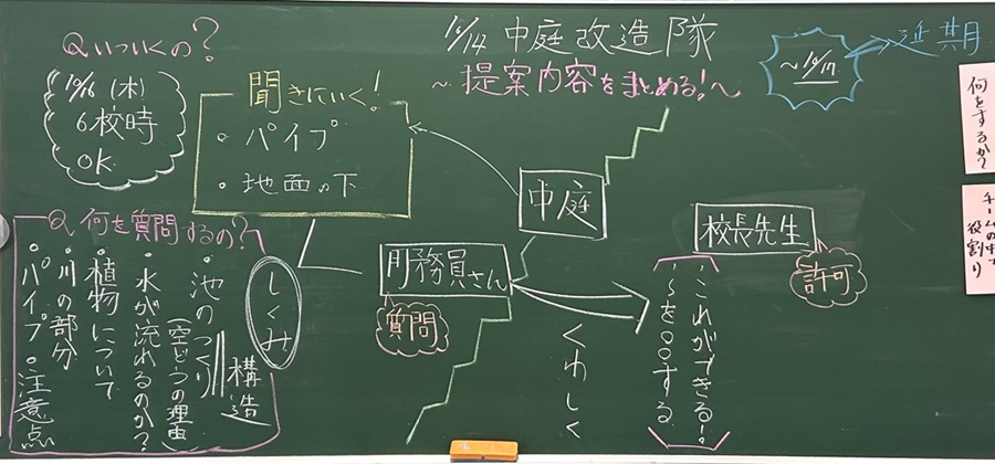 子どもたちは、中庭の池がどういった仕組みで成り立っているのか、水は循環するのかといった内容を質問したいと考えました。そして、実際に話を聞いた上で、「できること」と「できないこと」をはっきりさせ、その後校長先生に具体的な提案をしていこうと決めました。
