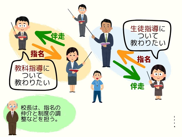 そして、このシステムの肝となる部分は、若手教員が自身に伴走してもらう中堅・ベテラン教員を指名することにあります。若手教員が「この人から学びたい」「こんな教員になりたい」と思いをもってバディを組むことが、教員の主体的な学びにつながります。